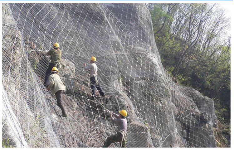 主动防护网是以钢丝绳网为主的各类柔性网覆盖包裹在所需防护斜坡或岩石上,限制坡面岩石土体的风化剥落或破坏以及危岩崩塌,将落石控制于一定运动范围内以保护行人和车辆安全通过的防护工具。